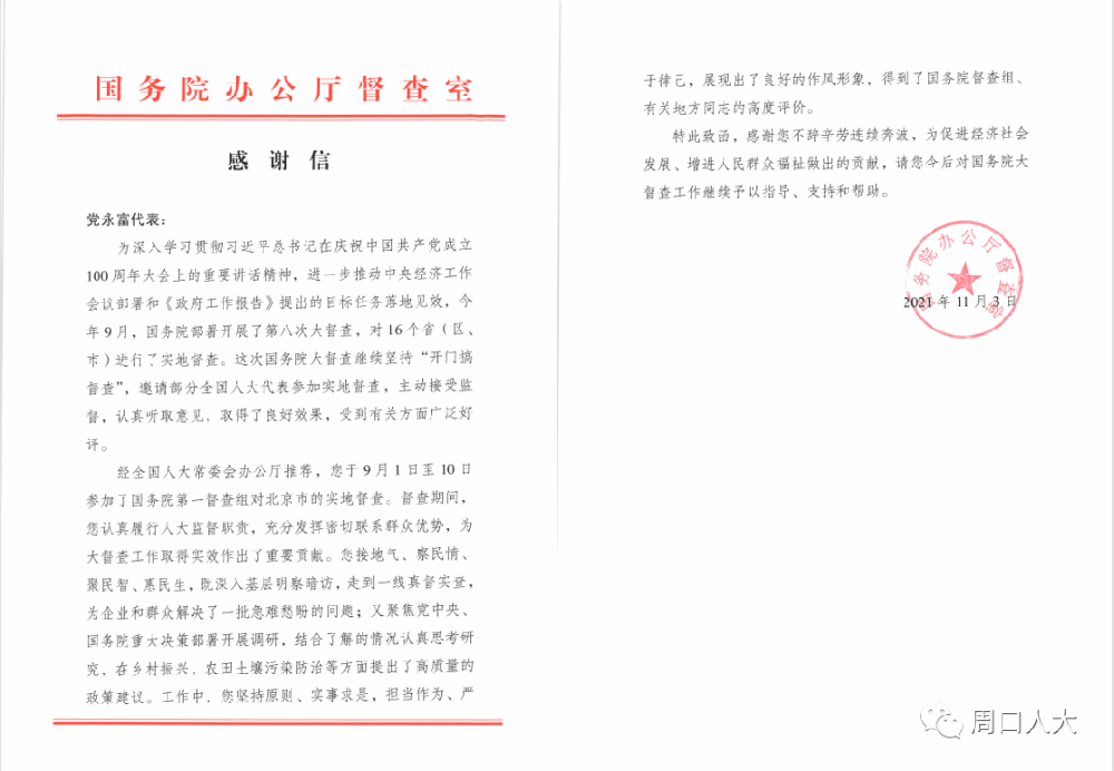 今年9月,国务院部署开展了第八次大督查,对16个省(区、市)进行了实地督查。全国人大代表党永富院士于9月1日至10日参加了国务院第一督察组对北京市的实地督查。期间,党永富院士对工作殚精竭虑,履职尽责,成绩斐然,受到了国务院相关部门肯定和得到了督察组高度认可。我们为党永富院士点赞!...