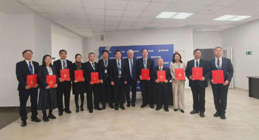 二是举行新当选院士证书颁发仪式。本次共有 10 位中国分院新当选院士接受颁证,其中包括 5 位院士、5 位通讯院士。颁证仪式庄重肃穆、秩序井然,黄正明副主席与亚历山大副主席依次为每位新院士颁发院士证书及工作证书。同期,远东分院 2 位新当选院士亦同台获颁证书。手捧证书,各位新院士精神振奋、倍感荣光,现场洋溢着庄重而喜悦的氛围(见图7、8、9)。