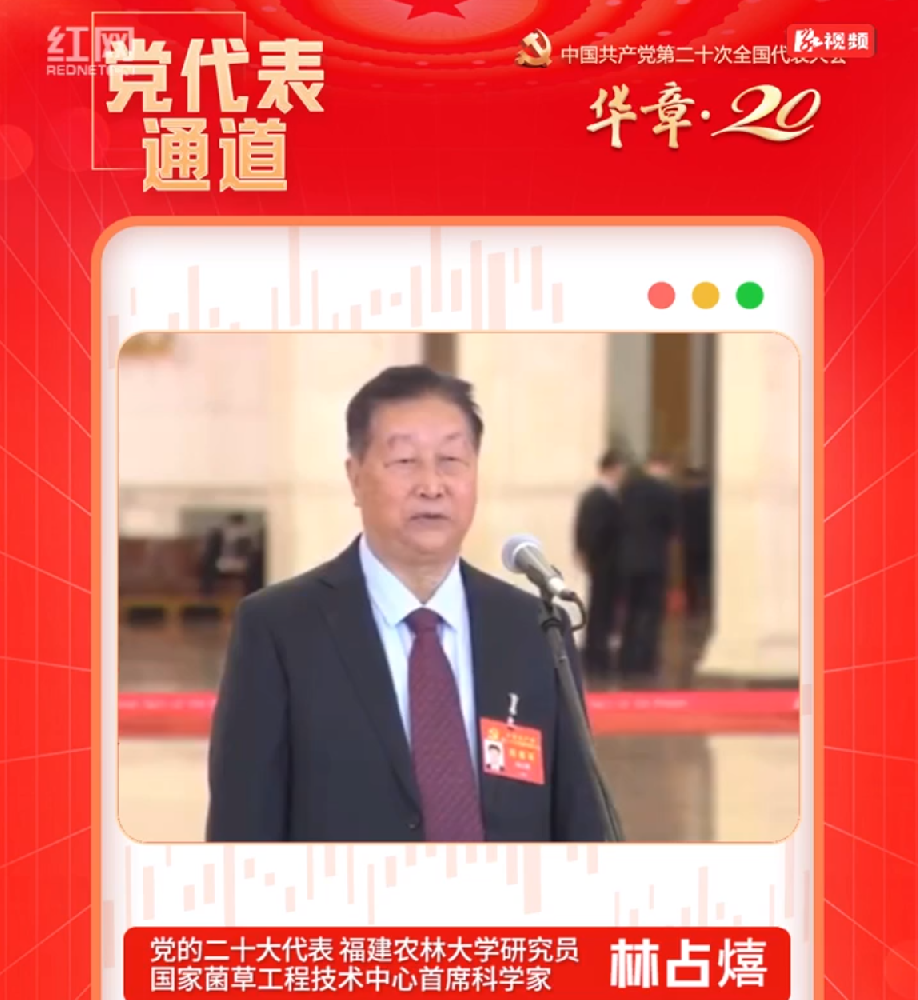 感言:作为党的二十大代表,我要牢记习近平总书记嘱托,持续推进菌草技术创新,服务乡村振兴战略,使菌草技术成为造福广大人民的“幸福草”。林占熺,男,汉族,1943年12月出生,1966年1月加入中国共产党,现任国家菌草工程技术研究中心(福建农林大学)首席科学家。先后获“全国优秀共产党员”“全国最美教师”“全国脱贫攻...